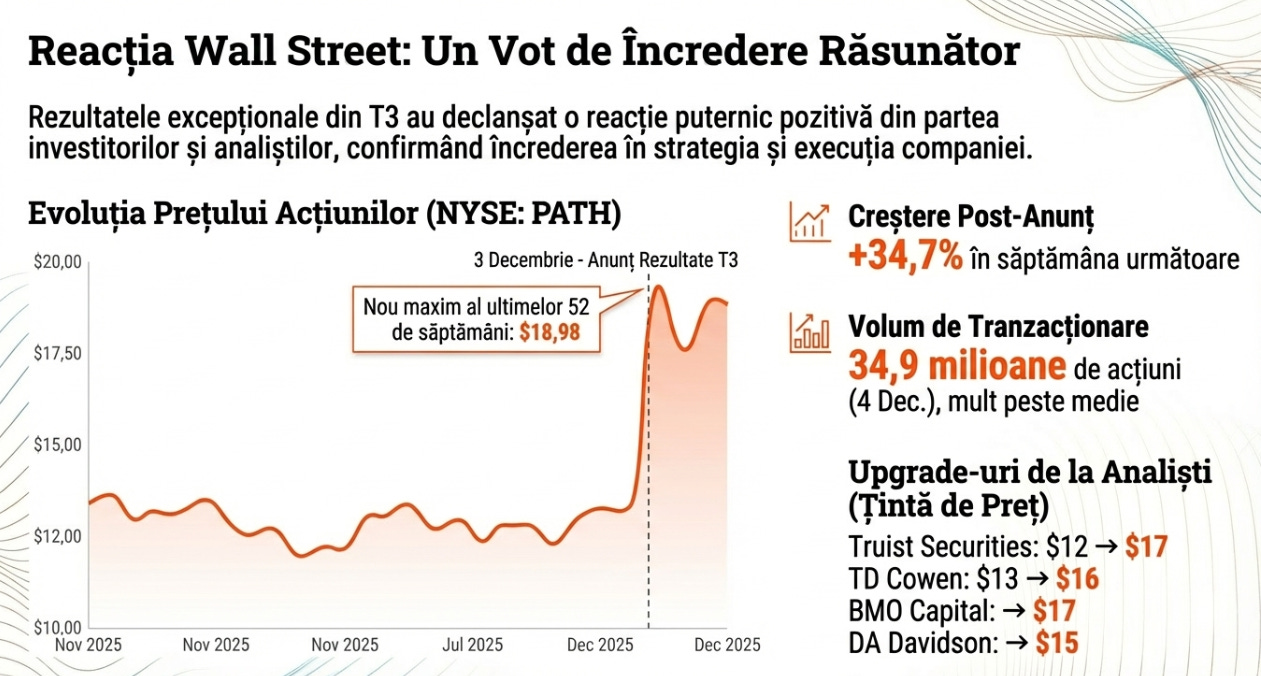 În urma publicării rezultatelor financiare pentru al treilea trimestru al anului fiscal 2026 (T3 AF2026), UiPath Inc. (PATH) a înregistrat o creștere semnificativă a acțiunilor, alimentată de performanțe care au depășit estimările analiștilor. Această analiză evaluează dacă aceste rezultate reprezintă un punct de inflexiune strategic real pentru companie în peisajul automatizării cu inteligență artificială sau doar un maxim ciclic, determinat de sentimentul general al pieței. Scopul este de a determina dacă impulsul actual este sustenabil și dacă evaluarea curentă este justificată.