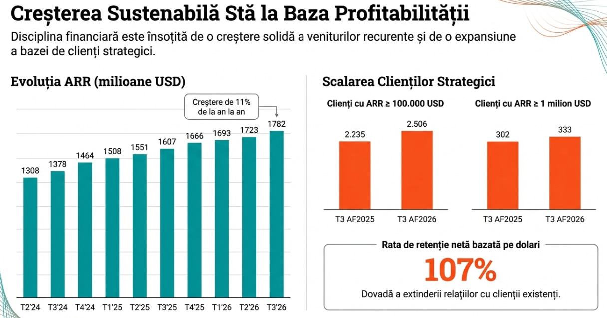 Creșterea ARR: Veniturile anuale recurente (ARR) au ajuns la 1,782 miliarde USD, o creștere de 11% de la an la an.